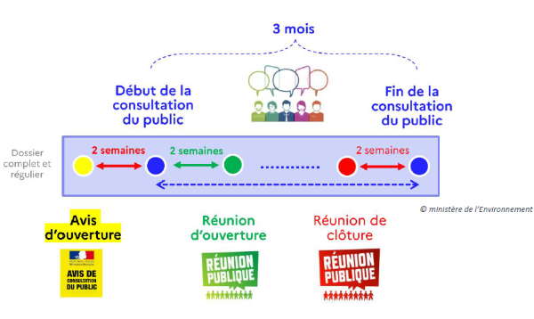 À noter que la phase de consultation du public compte deux réunions publiques obligatoires : une réunion d’ouverture (dans les 15 premiers jours) et une réunion de clôture (dans les 15 derniers jours).